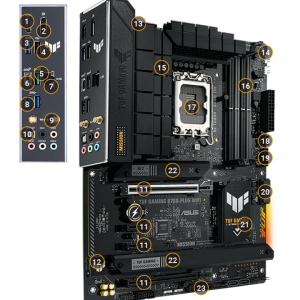 - Back Panel I/O Ports: Includes USB, DisplayPort, HDMI™, Wi-Fi Module, Ethernet, audio, and S/PDIF out ports